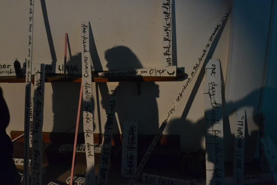 A sculptural poem constructed live from found wood painted white and applied text using group sourced content from overheard conversations within the audience. The site specific piece reflects the feeling of the environment it is born from, a night of happenings commissioned by Theatre Dot Dash. The piece was made in collaboration with Tom Swift.